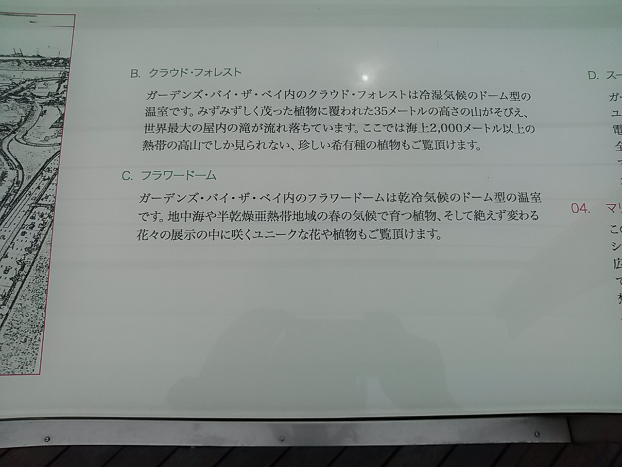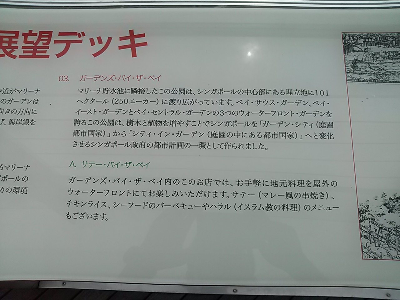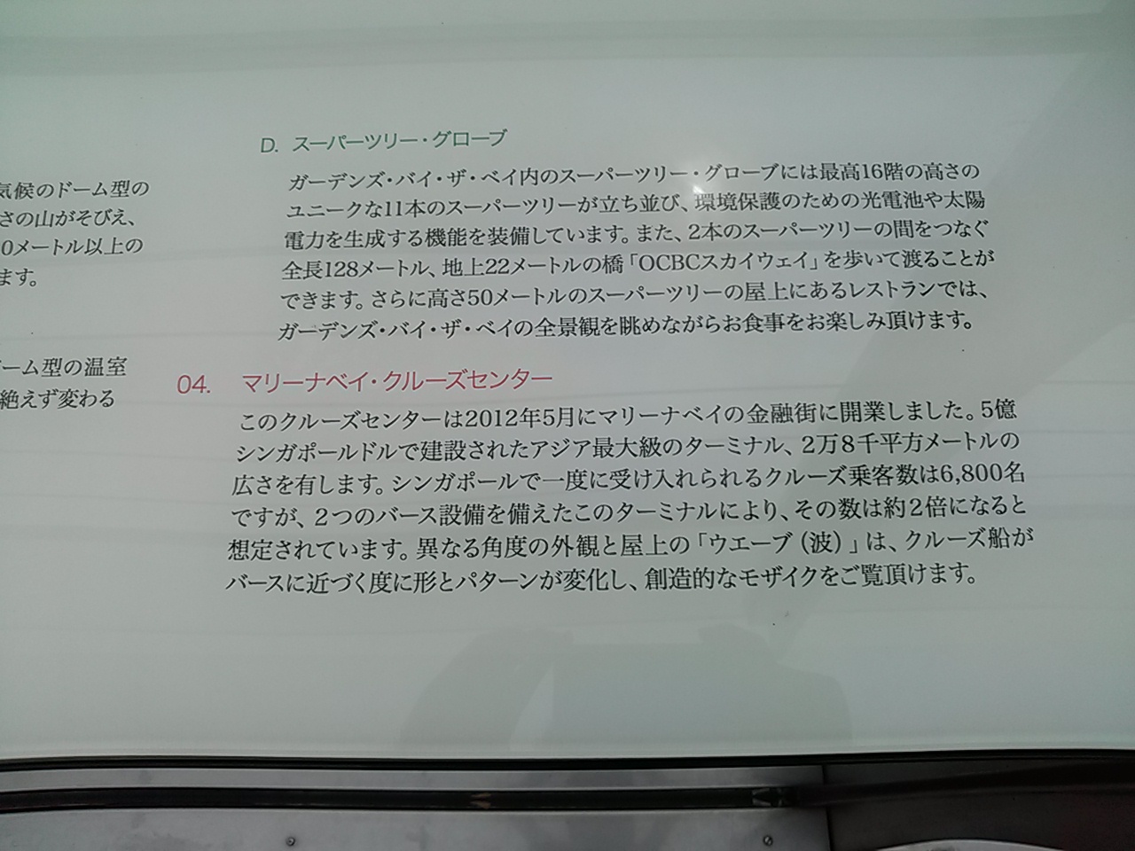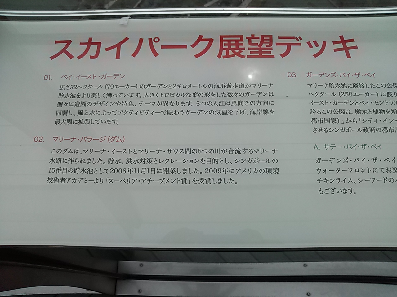 マリーナベイ・サンズ 未選択 2014年10月27日 0 どもども(ノ)・ω・(ヾ)今回は予告にあったマリーナベイ・サンズです。 日本を立つときに空港でまっぷるガイドを見つけて買ったのが幸い。無事に展望デッキへ登れました。<展望デッキの行き方>チケットをtower3の地下一階チケット売り場で購入。お値段なんと S$23-(約1800円)\(^o^)/地下にある直通エレベーターを利用していきます。エレベーター乗る前になんか写真撮影に強制参加。なんだなんだ?と思っていたらエレベーターを降りた後に記念の合成写真を売りつけられました(^ω^;)(別に買わなくても大丈夫です) お値段はフォトフレームアリでなななんと S$50-(約4000円)\(^o^)/記念なので買っちゃいましたが、合成がかなり安っぽいですwwwフレームなしの写真だけ買うと30ドルぐらいだったかな?流石にそっちの選択肢はないなぁって感じでしたね(´・ω・`)景色はなかなかでした(ノ)・ω・(ヾ)お土産売り場もあったり。3枚目微妙にマーライオン写ってます。見つけられるかな?o(*'ω'*)o ちょっとプール見える。浦山\(^o^)/ 日本語の案内板も。 お次は最初の写真でビルの手前に写ってるドーム型のほうです。中はショッピングモールになってます。地下二階には建物内に運河があったり。 噴水広場では10:00、13:00、15:00、17:00、20:00、21:30、23:00に上から水が降ってくる”逆噴水”が見られます。タイミングよく13:00に見ることができました( ^ω^) 外出た後で周りの風景をムービー撮影してみました。ではでは今回はこの辺で。次回は観覧車、そしてついにマーライオンとご対面! PR